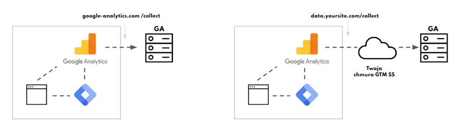 W „tradycyjnej” wersji GTM tagi uruchamiają skrypt np. Google Analytics w przeglądarce użytkownika i dane są wysyłane bezpośrednio na serwer Google.