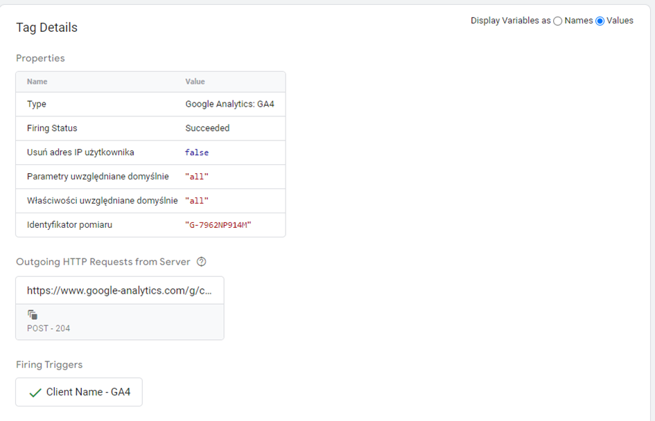 12. Wracając do trybu debugowania Google Tag Managera po stronie serwera, zobaczysz, że tag został uruchomiony i dane zostały przekazane na serwer Google’a.